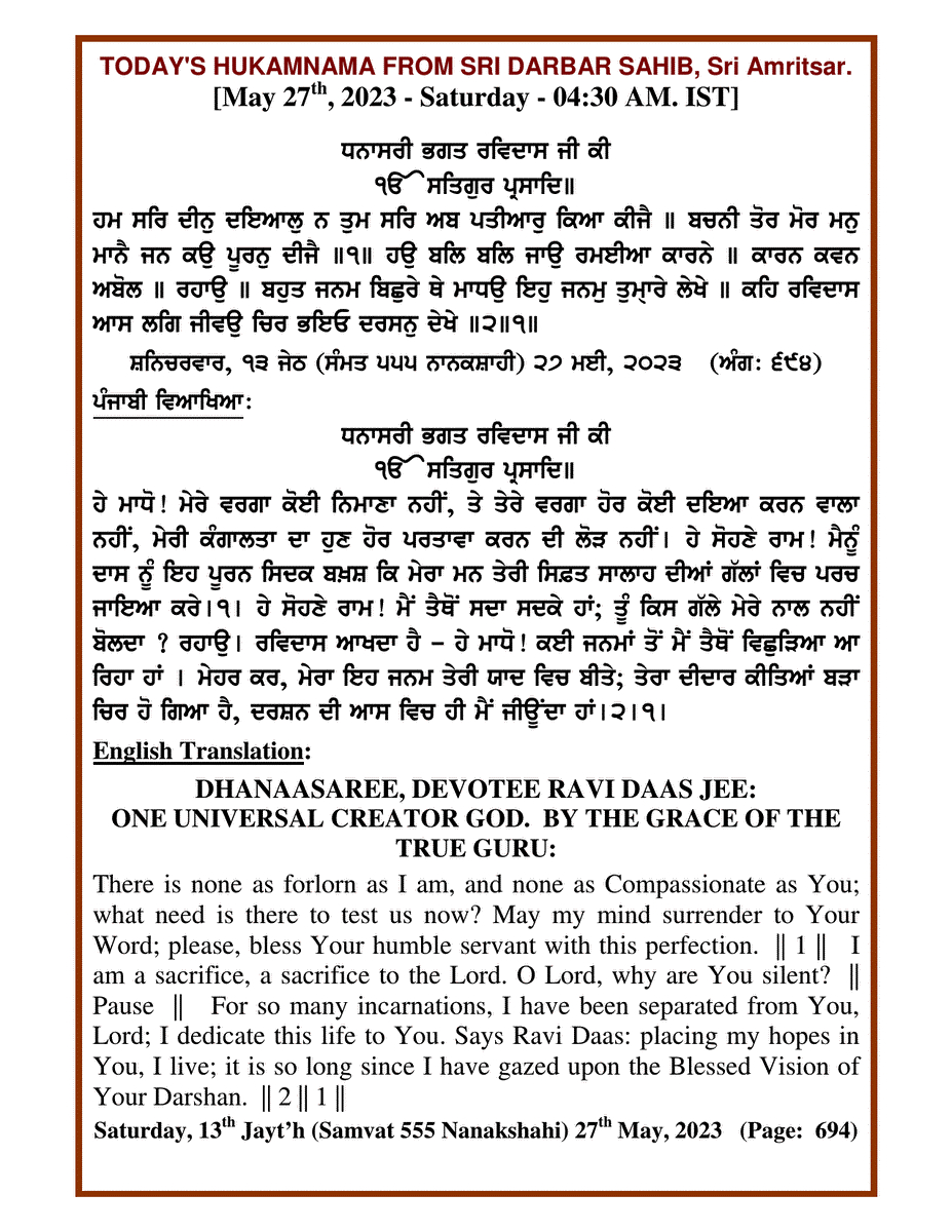 Source : SGPC Post navigation Today’s MUKHWAK Sri Darbar Saheb Amritsar – May 26th, 2023 Today’s MUKHWAK Sri Darbar Saheb Amritsar – May 28th, 2023