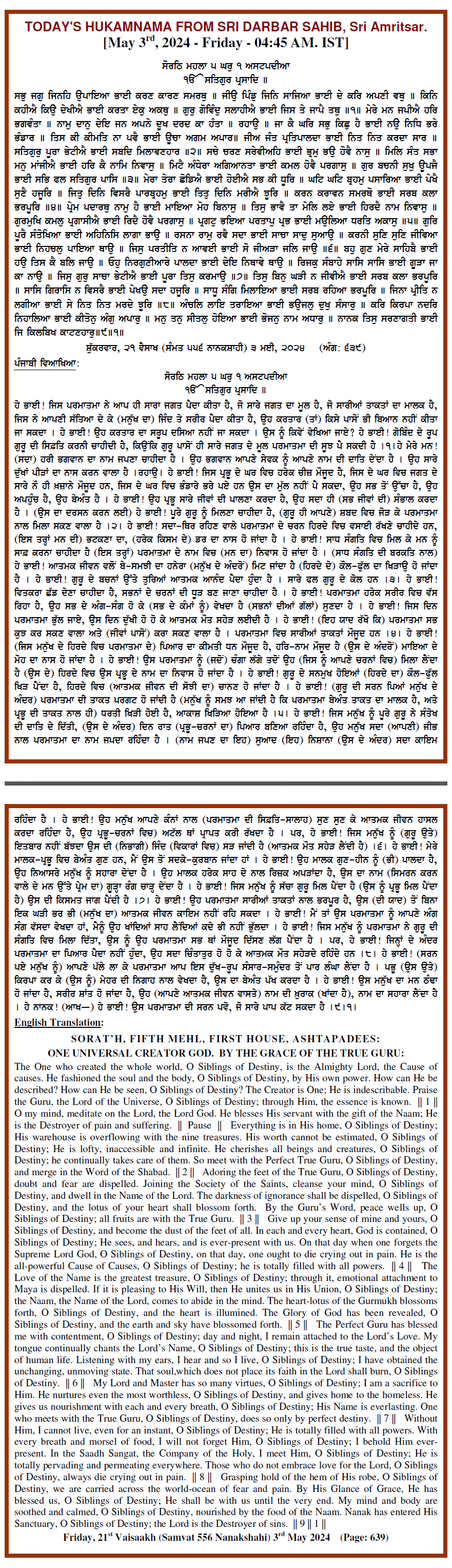 Source : SGPC Post navigation Today’s MUKHWAK Sri Darbar Saheb Amritsar – May 2nd, 2024 Today’s MUKHWAK Sri Darbar Saheb Amritsar – May 4th, 2024