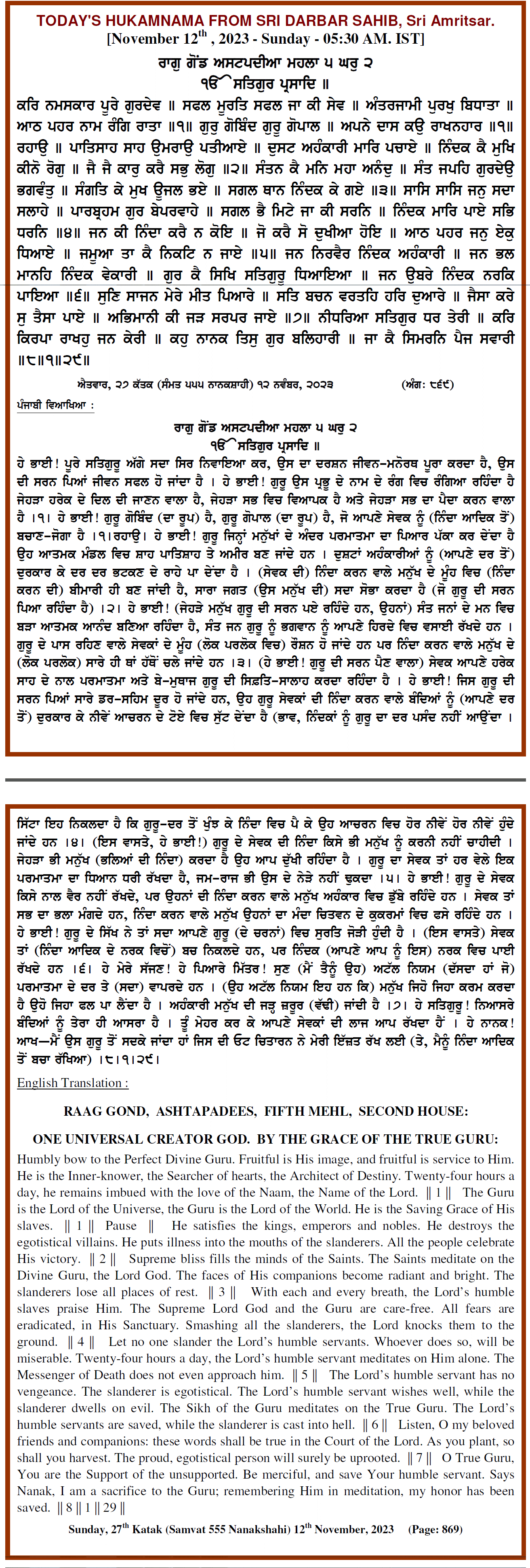 Source : SGPC Post navigation Today’s MUKHWAK Sri Darbar Saheb Amritsar – November 11th, 2023 Today’s MUKHWAK Sri Darbar Saheb Amritsar – November 13th, 2023