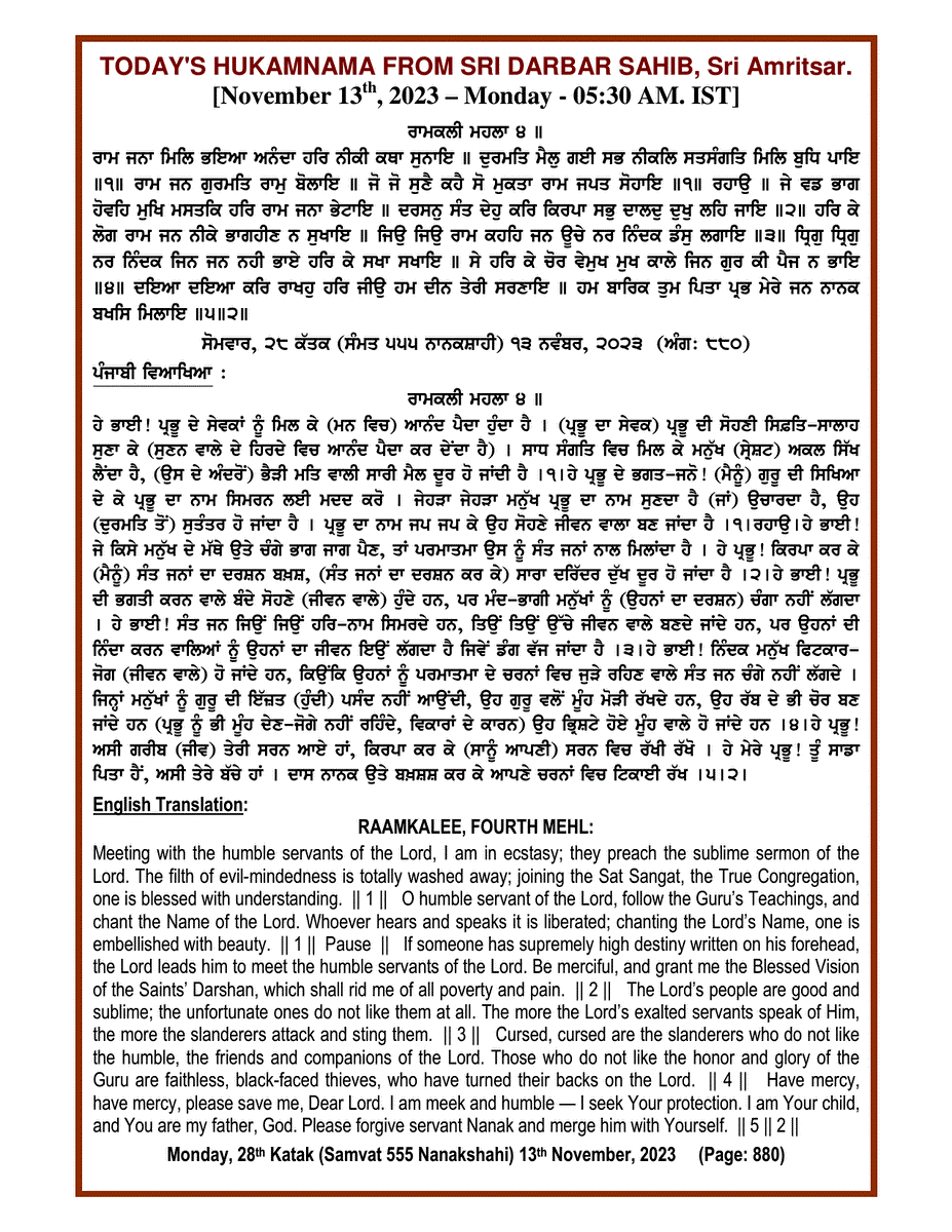 Source : SGPC Post navigation Today’s MUKHWAK Sri Darbar Saheb Amritsar – November 12th, 2023 Today’s MUKHWAK Sri Darbar Saheb Amritsar – November 14th, 2023