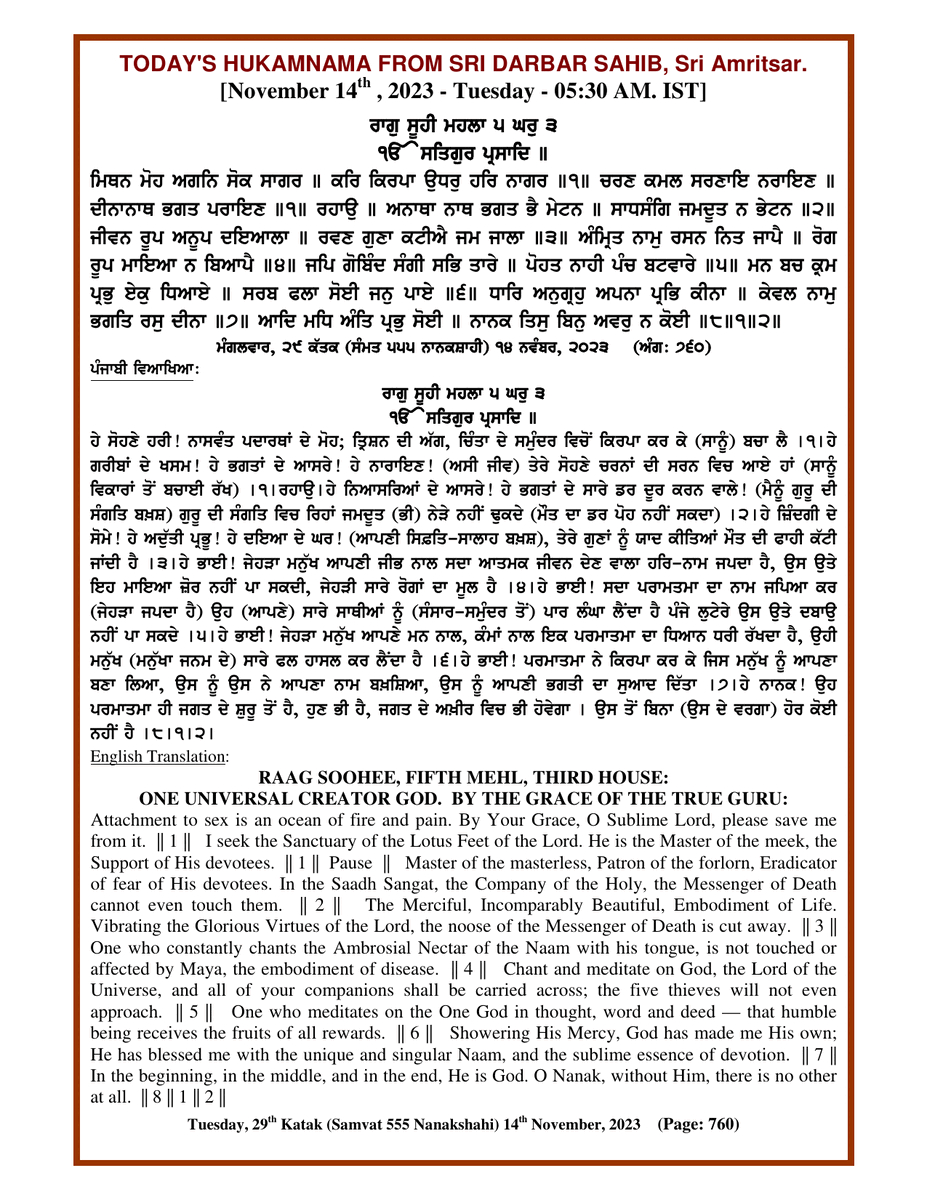 Source : SGPC Post navigation Today’s MUKHWAK Sri Darbar Saheb Amritsar – November 13th, 2023 Today’s MUKHWAK Sri Darbar Saheb Amritsar – November 15th, 2023