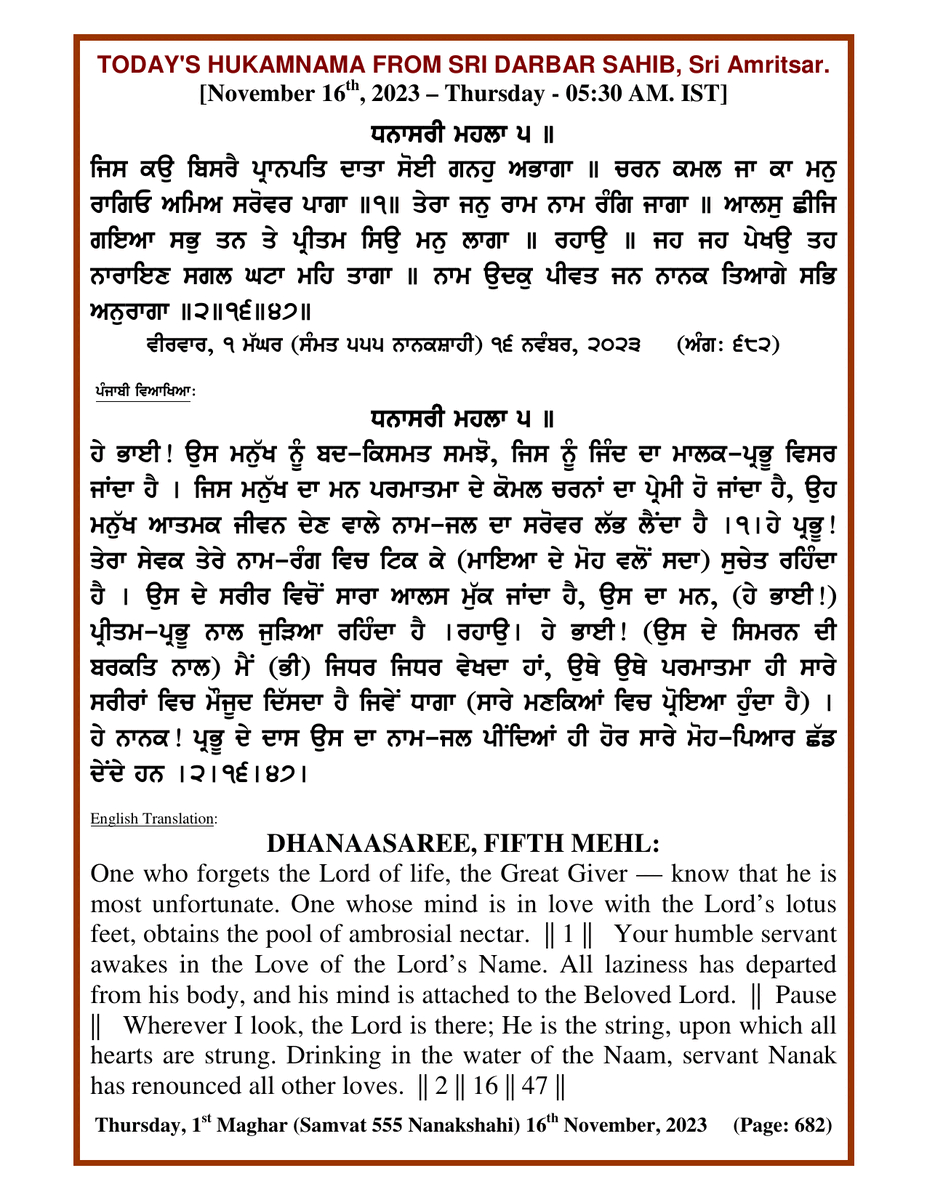 Source : SGPC Post navigation Today’s MUKHWAK Sri Darbar Saheb Amritsar – November 15th, 2023 Today’s MUKHWAK Sri Darbar Saheb Amritsar – November 17th, 2023