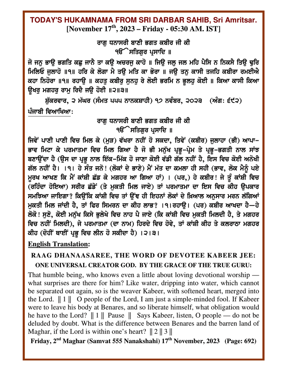 Source : SGPC Post navigation Today’s MUKHWAK Sri Darbar Saheb Amritsar – November 16th, 2023 Today’s MUKHWAK Sri Darbar Saheb Amritsar – November 18th, 2023