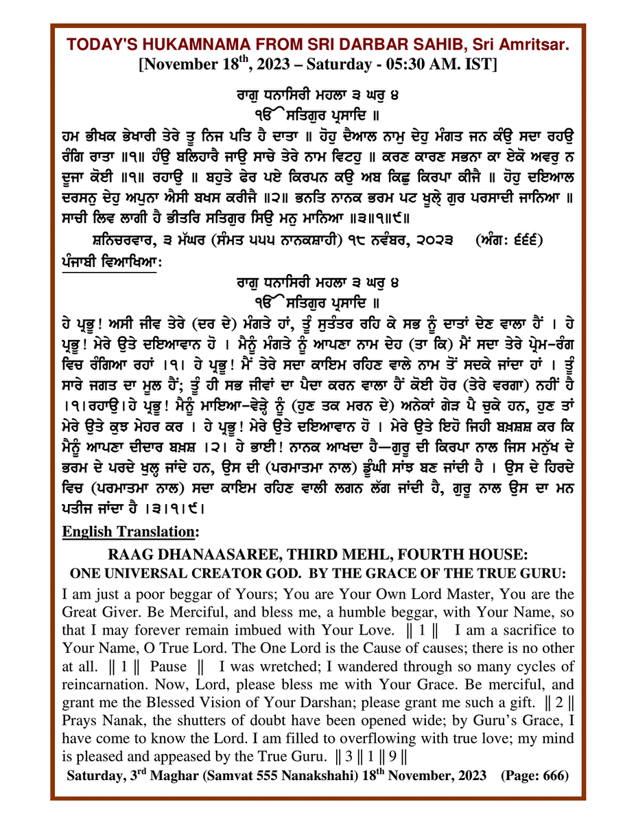 Source : SGPC Post navigation Today’s MUKHWAK Sri Darbar Saheb Amritsar – November 17th, 2023 Today’s MUKHWAK Sri Darbar Saheb Amritsar – November 19th, 2023