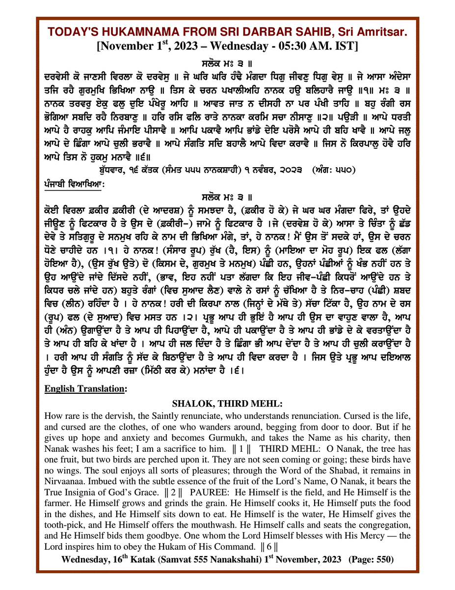 Source : SGPC Post navigation Today’s MUKHWAK Sri Darbar Saheb Amritsar – October 31st, 2023 Today’s MUKHWAK Sri Darbar Saheb Amritsar – November 2nd, 2023