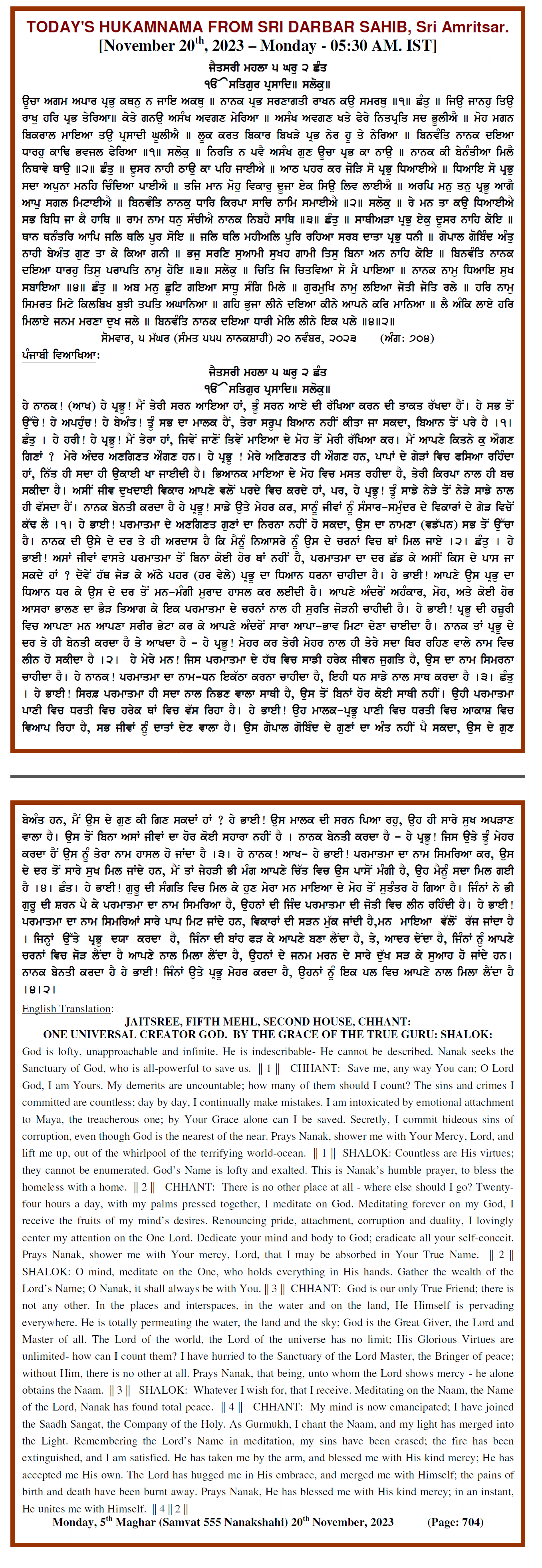 Source : SGPC Post navigation Today’s MUKHWAK Sri Darbar Saheb Amritsar – November 19th, 2023 Today’s MUKHWAK Sri Darbar Saheb Amritsar – November 21st, 2023