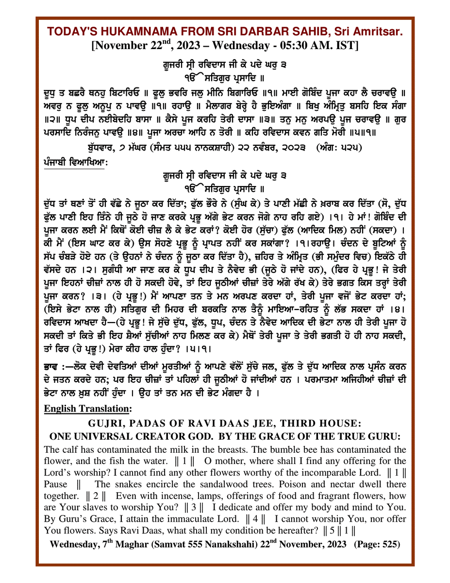 Source : SGPC Post navigation Today’s MUKHWAK Sri Darbar Saheb Amritsar – November 21st, 2023 Today’s MUKHWAK Sri Darbar Saheb Amritsar – November 23rd, 2023