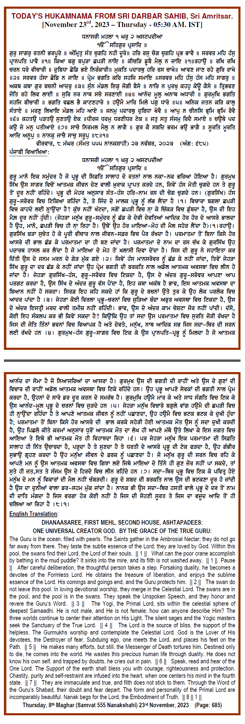 Source : SGPC Post navigation Today’s MUKHWAK Sri Darbar Saheb Amritsar – November 22nd, 2023 Today’s MUKHWAK Sri Darbar Saheb Amritsar – November 24th, 2023