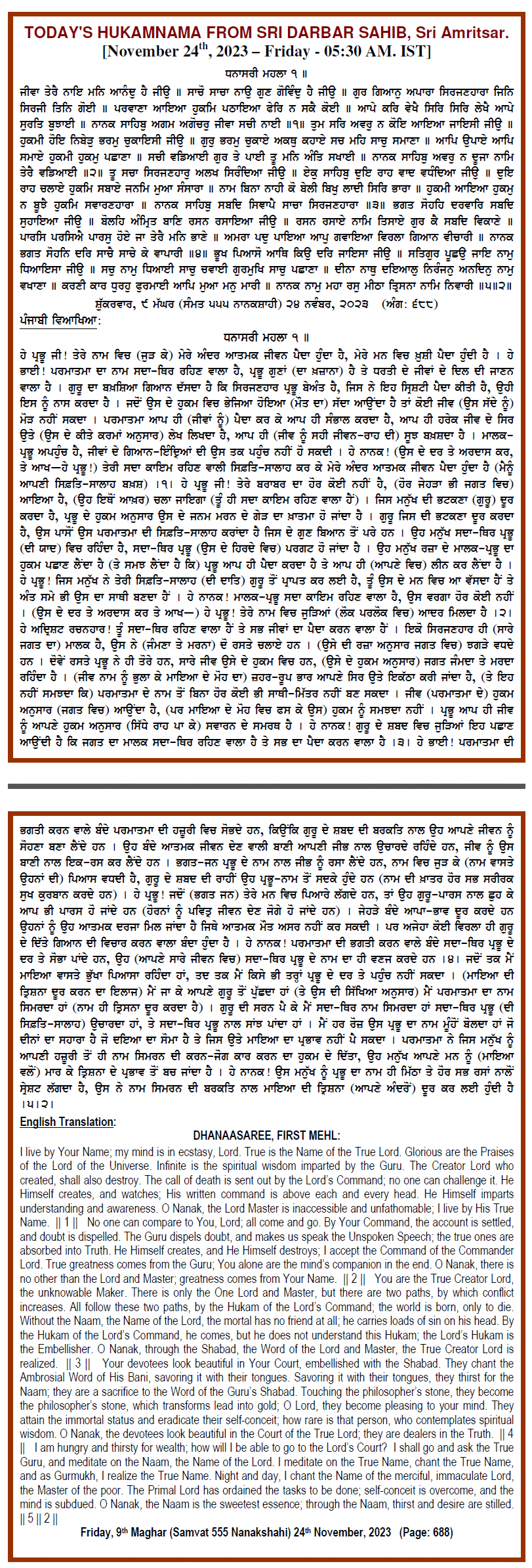 Source : SGPC Post navigation Today’s MUKHWAK Sri Darbar Saheb Amritsar – November 23rd, 2023 Today’s MUKHWAK Sri Darbar Saheb Amritsar – November 25th, 2023
