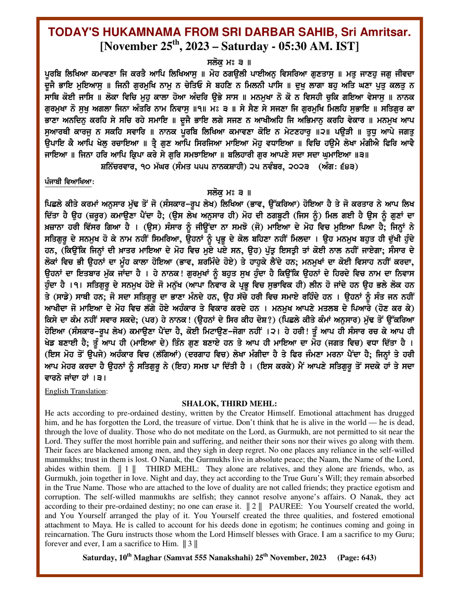 Source : SGPC Post navigation Today’s MUKHWAK Sri Darbar Saheb Amritsar – November 24th, 2023 Today’s MUKHWAK Sri Darbar Saheb Amritsar – November 26th, 2023