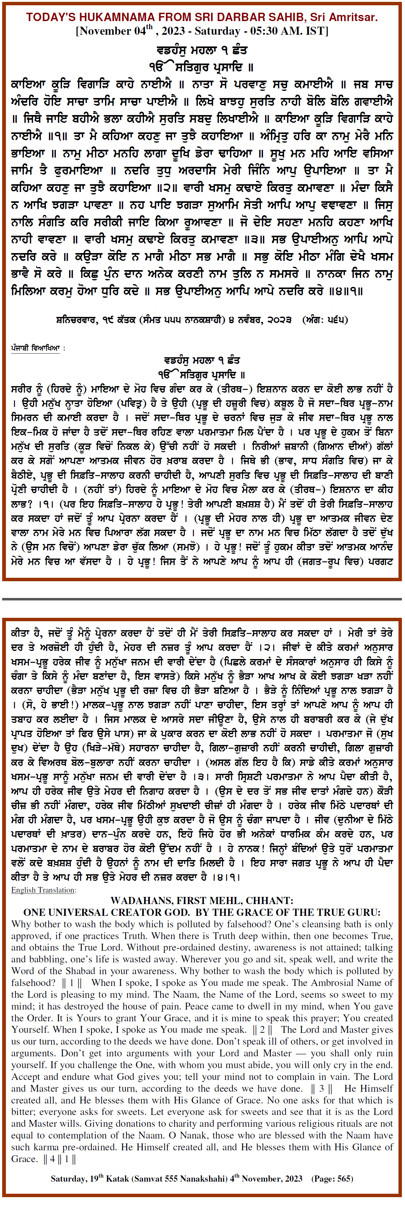 Source : SGPC Post navigation Today’s MUKHWAK Sri Darbar Saheb Amritsar – November 3rd, 2023 Today’s MUKHWAK Sri Darbar Saheb Amritsar – November 5th, 2023