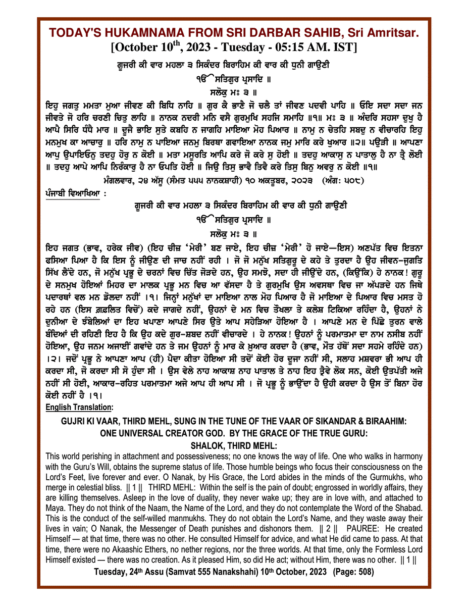 Source : SGPC Post navigation Today’s MUKHWAK Sri Darbar Saheb Amritsar – October 9th, 2023 Today’s MUKHWAK Sri Darbar Saheb Amritsar – October 11th, 2023