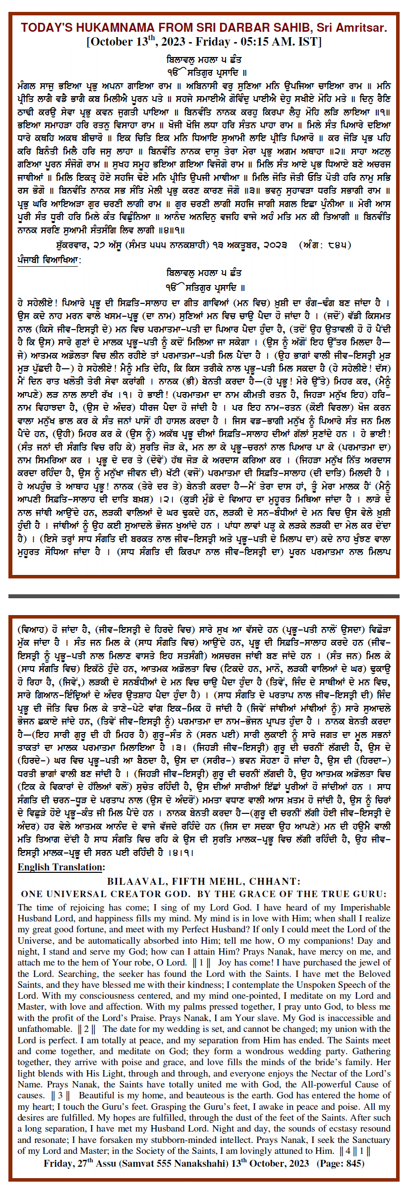Source : SGPC Post navigation Today’s MUKHWAK Sri Darbar Saheb Amritsar – October 12th, 2023 Today’s MUKHWAK Sri Darbar Saheb Amritsar – October 14th, 2023