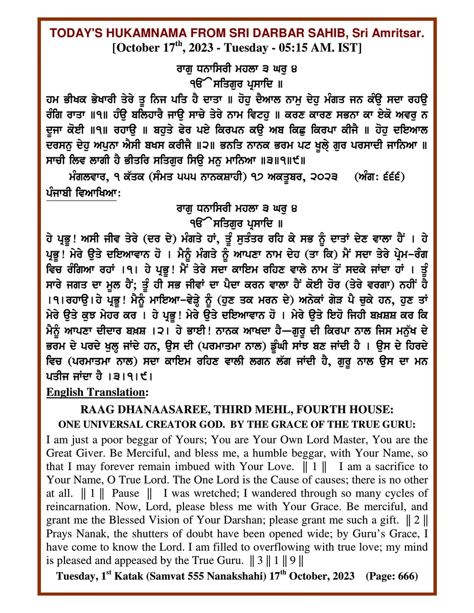 Source : SGPC Post navigation Today’s MUKHWAK Sri Darbar Saheb Amritsar – October 16th, 2023 Today’s MUKHWAK Sri Darbar Saheb Amritsar – October 18th, 2023