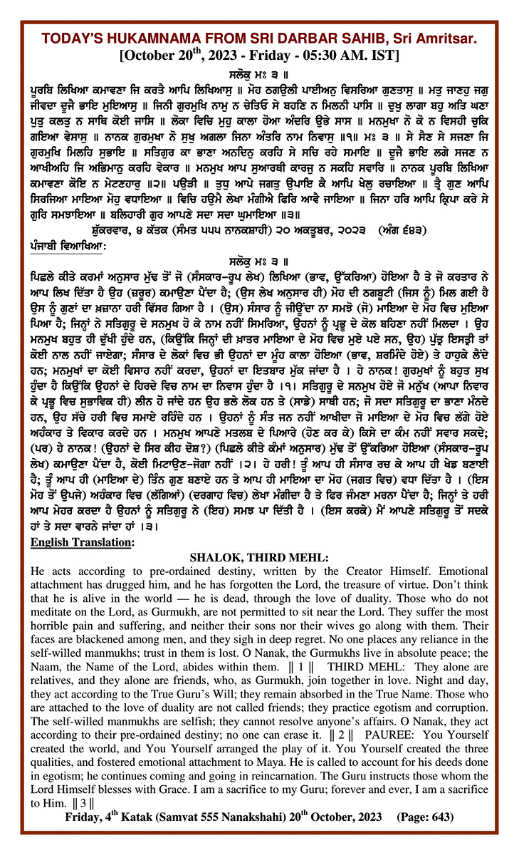 Source : SGPC Post navigation Today’s MUKHWAK Sri Darbar Saheb Amritsar – October 19th, 2023 Today’s MUKHWAK Sri Darbar Saheb Amritsar – October 21st, 2023