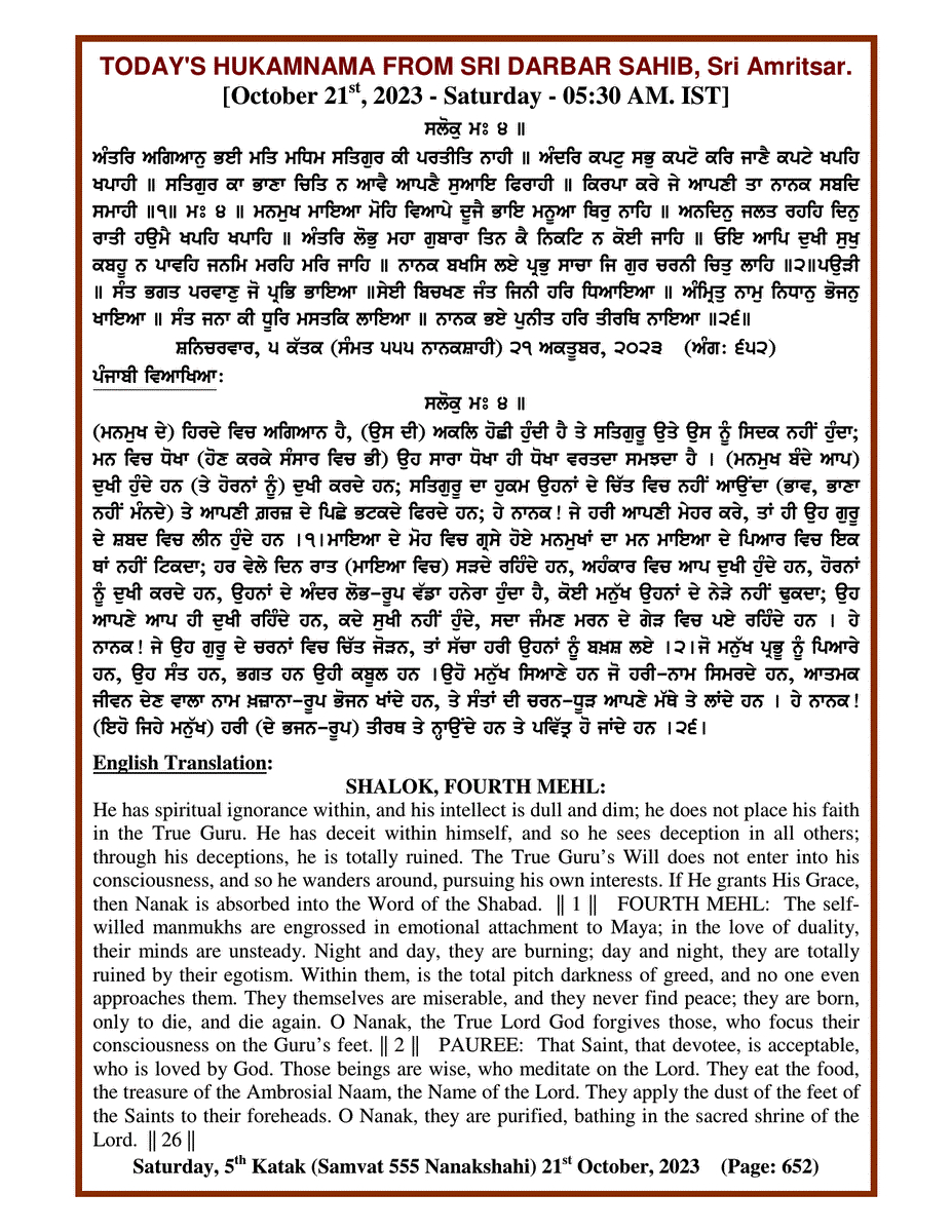 Source : SGPC Post navigation Today’s MUKHWAK Sri Darbar Saheb Amritsar – October 20th, 2023 Today’s MUKHWAK Sri Darbar Saheb Amritsar – October 22nd, 2023