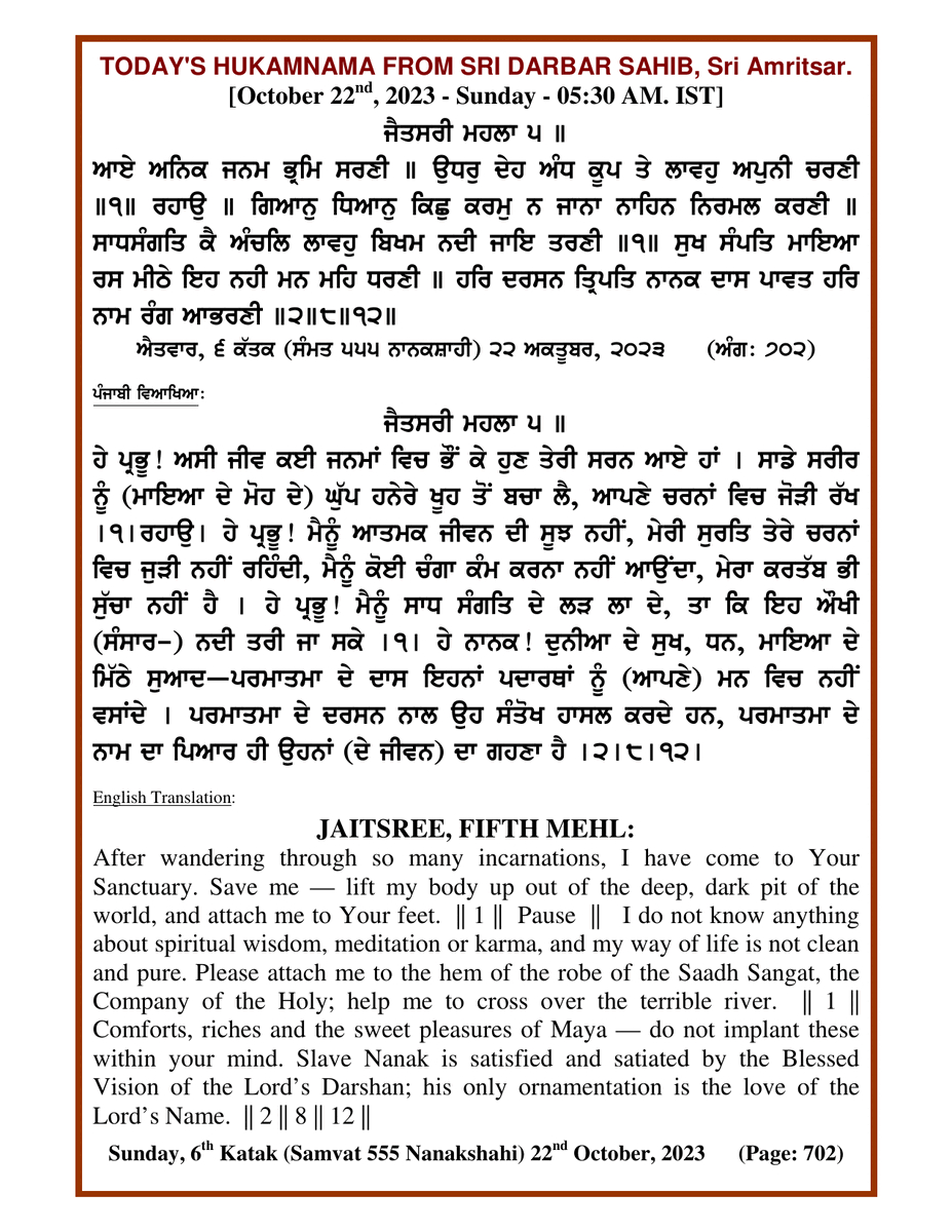 Source : SGPC Post navigation Today’s MUKHWAK Sri Darbar Saheb Amritsar – October 21st, 2023 Today’s MUKHWAK Sri Darbar Saheb Amritsar – October 23rd, 2023