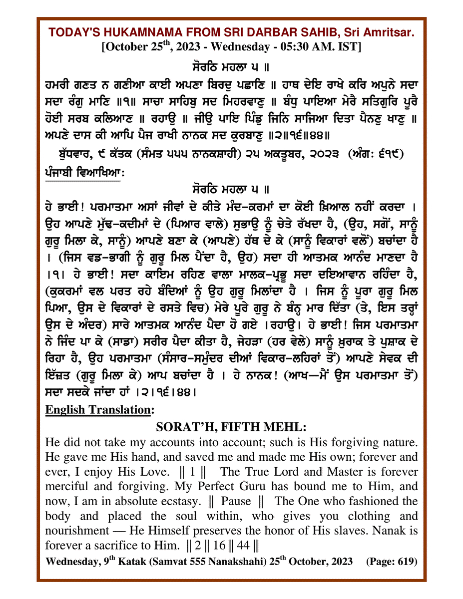 Source : SGPC Post navigation Today’s MUKHWAK Sri Darbar Saheb Amritsar – October 24th, 2023 Today’s MUKHWAK Sri Darbar Saheb Amritsar – October 26th, 2023