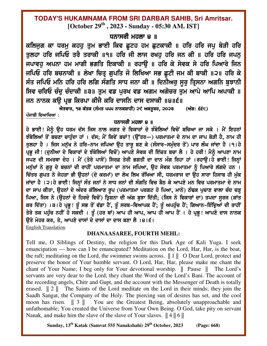Source : SGPC Post navigation Today’s MUKHWAK Sri Darbar Saheb Amritsar – October 28th, 2023 Today’s MUKHWAK Sri Darbar Saheb Amritsar – October 30th, 2023