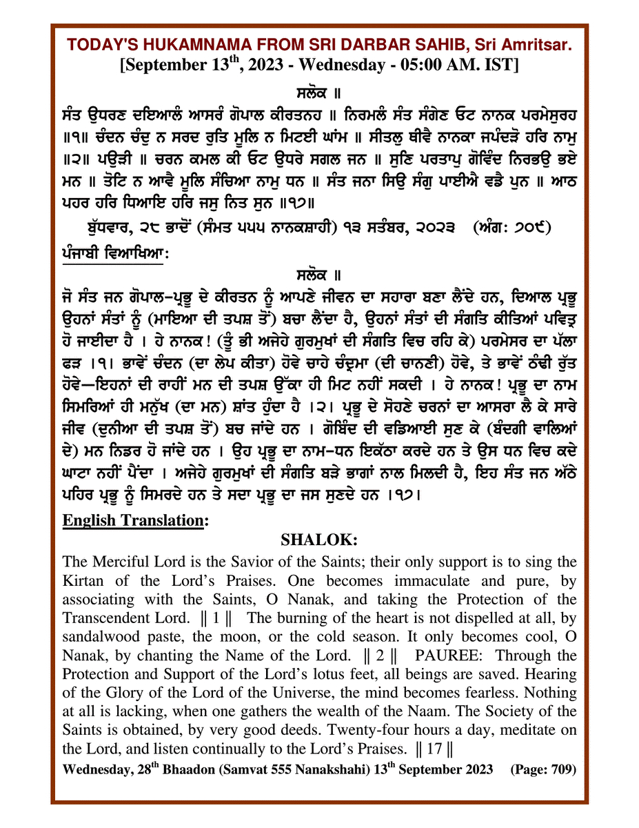 Source : SGPC Post navigation Today’s MUKHWAK Sri Darbar Saheb Amritsar – September 12th, 2023 Today’s MUKHWAK Sri Darbar Saheb Amritsar – September 14th, 2023
