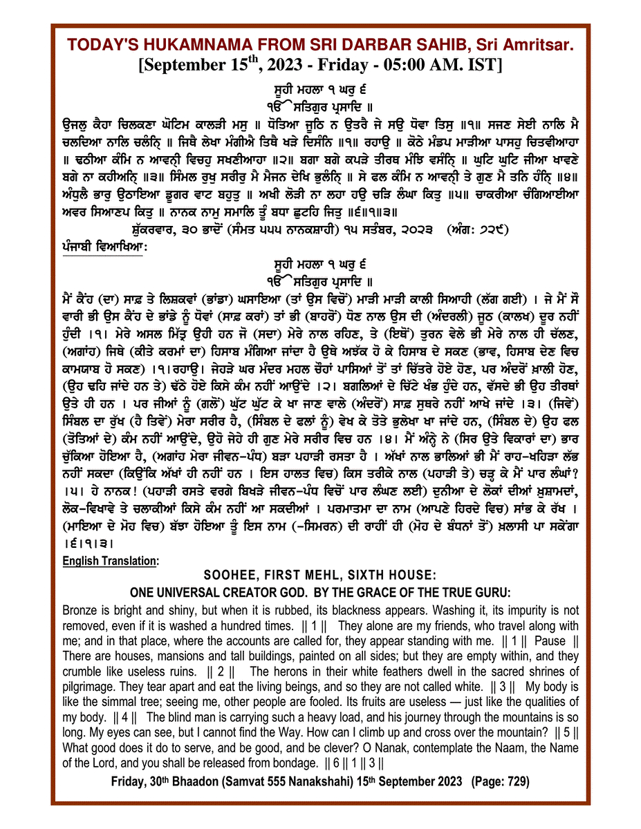 Source : SGPC Post navigation Today’s MUKHWAK Sri Darbar Saheb Amritsar – September 14th, 2023 Today’s MUKHWAK Sri Darbar Saheb Amritsar – September 16th, 2023