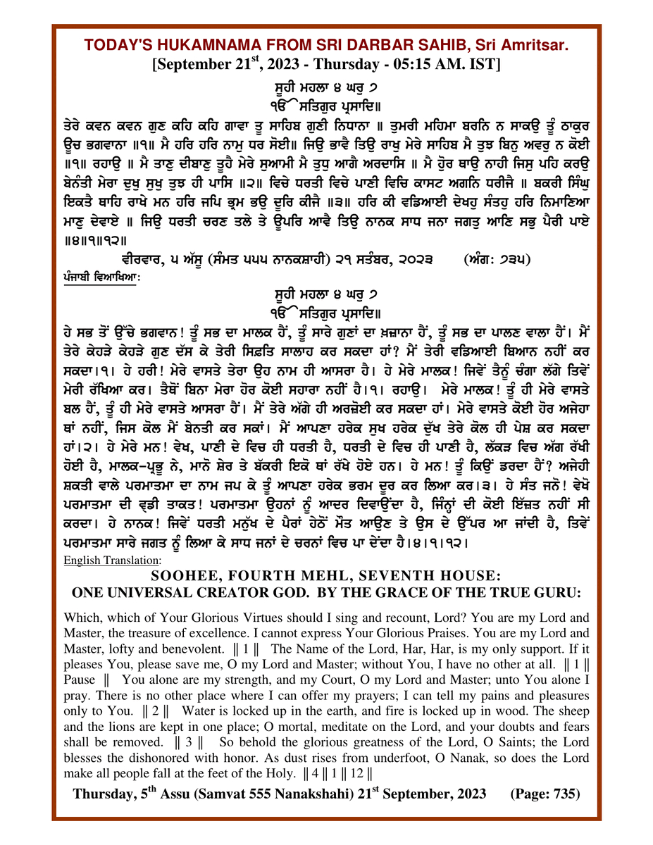 Source : SGPC Post navigation Today’s MUKHWAK Sri Darbar Saheb Amritsar – September 21st, 2023 Today’s MUKHWAK Sri Darbar Saheb Amritsar – September 23rd, 2023