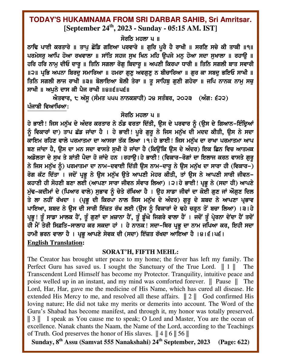 Source : SGPC Post navigation Today’s MUKHWAK Sri Darbar Saheb Amritsar – September 24th, 2023 Today’s MUKHWAK Sri Darbar Saheb Amritsar – September 26th, 2023