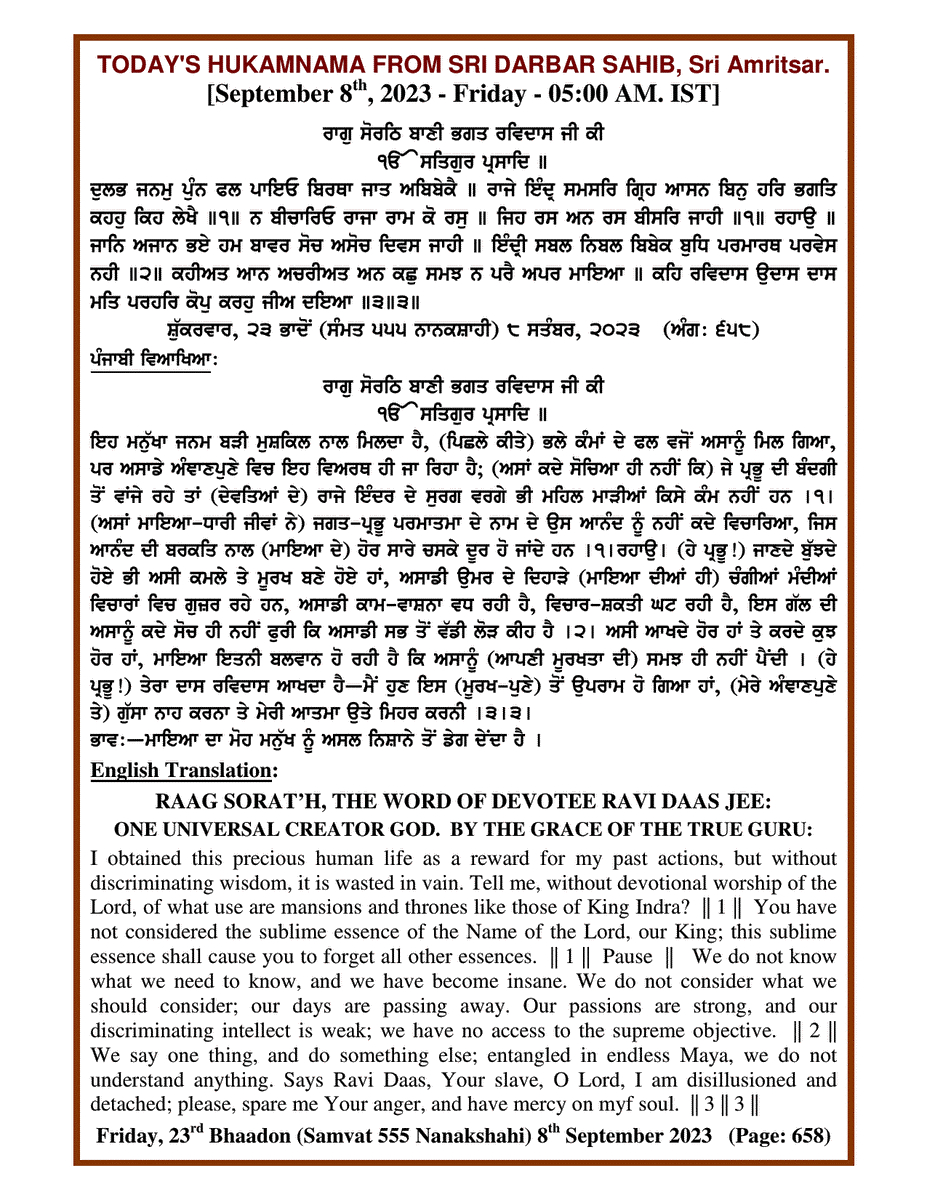 Source : SGPC Post navigation Today’s MUKHWAK Sri Darbar Saheb Amritsar – September 7th, 2023 Today’s MUKHWAK Sri Darbar Saheb Amritsar – September 9th, 2023