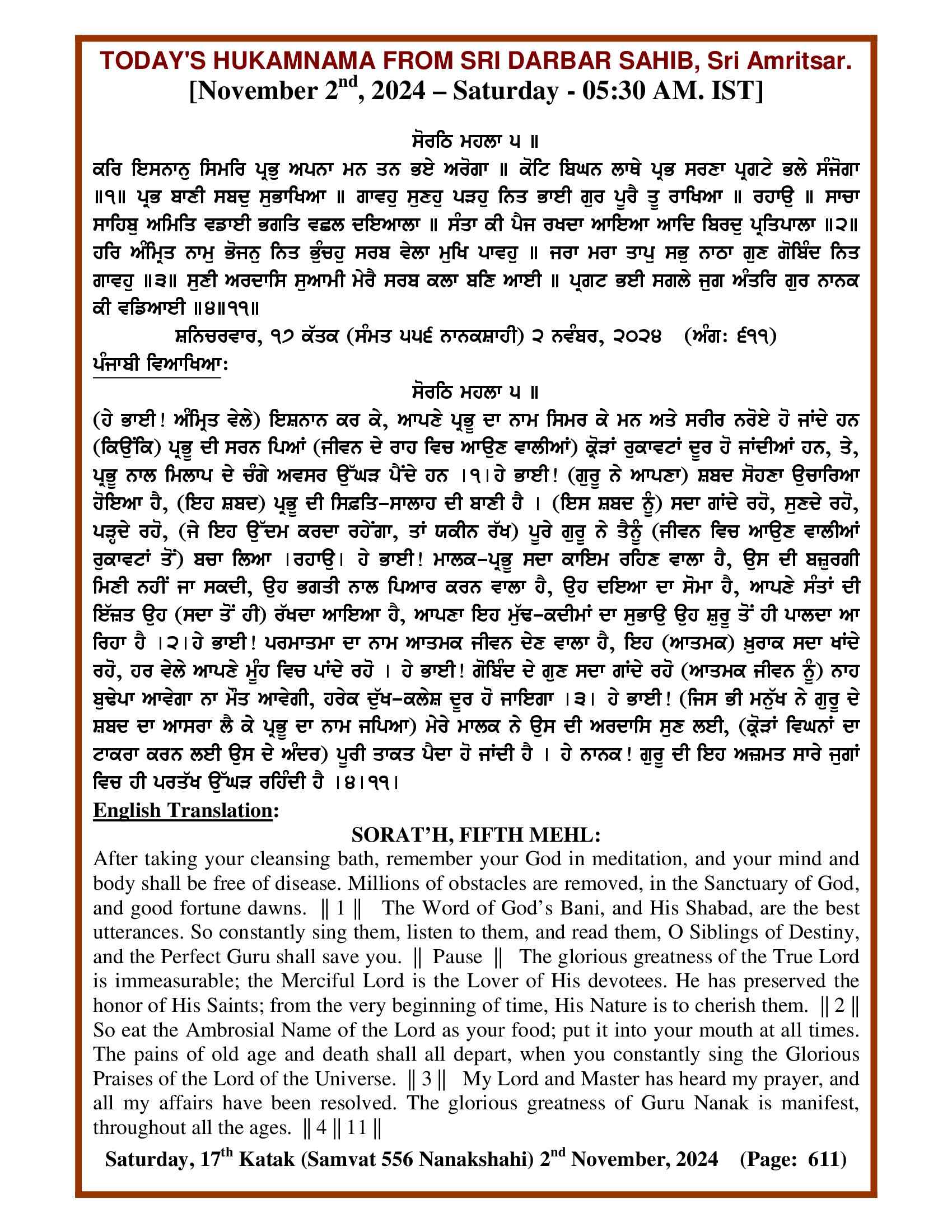 Source : SGPC Post navigation Today’s Mukhwak Sri Darbar Saheb – November 1st, 2024 Today’s Mukhwak Sri Darbar Saheb – November 3rd, 2024