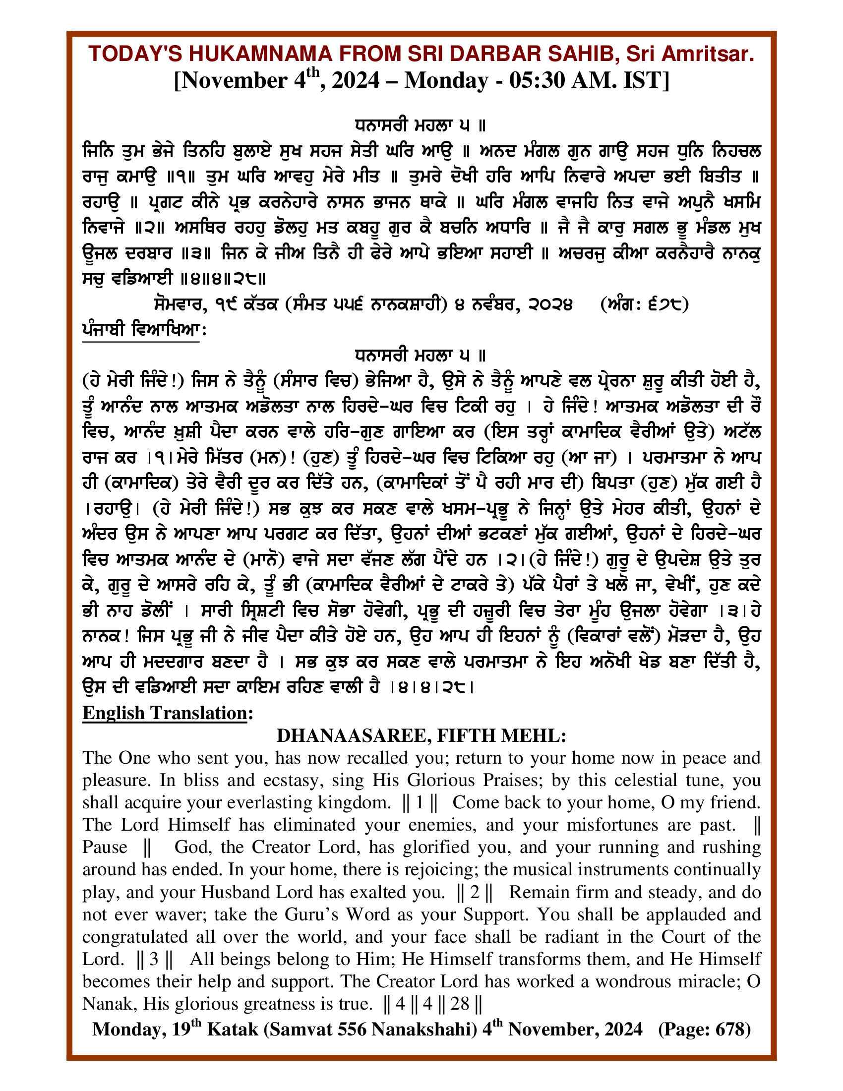 Source : SGPC Post navigation Today’s Mukhwak Sri Darbar Saheb – November 3rd, 2024 Today’s Mukhwak Sri Darbar Saheb – November 5th, 2024